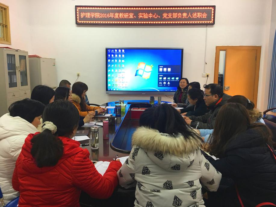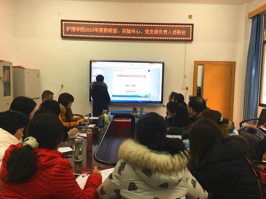 实验中心主任许金华老师对护理实验室中心2016年的工作进行汇报,提出将不断加强实验教学和实验室的建设。欧阳丽老师详细汇报了社区护理教研室的工作,并总结了教研室获得的教学奖项和科研成绩等,提出未来三年的规划。她表明将重点推进教学任务改革,加强教研室师资队伍建设,不断培养师资力量。基础护理教研室主任王蓉老师依次从师资队伍、教学教改、科学研究、国际交流及奖励与社会任职五个方面进行了汇报,并指出本教研室存在的不足和努力方向以及2017年的工作重点。外科护理教研室主任曾谷清老师从课程建设、教材编写及科研工作、教学教改、实践教学任务、教学过程管理等六个方面进行总结,并提出2017年工作计划。内科护理教研室胡丽老师重点介绍了新型课堂模式“课堂派”的教学经验,她表明“课堂派”的应用不仅提高了教师的教学效率,更为同学们提供了多渠道的学校资源。