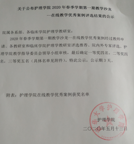 2020年5月13日下午,学院开展在线教学案例评选,经院内外专家评审,评选出一等奖四名,分别是护理学院王蓉、伍春;第二临床学院刘桂芳团队;南华临床学院仇秋菊。二等奖四名,分别是护理学院尹心红、赵玲;第一临床学院欧玉兰团队、第二临床学院谭玲玲团队。三等奖五名,分别是护理学院胡红娟、吴飞;第二临床学院颜华艳团队;南华临床学院伍思娜。