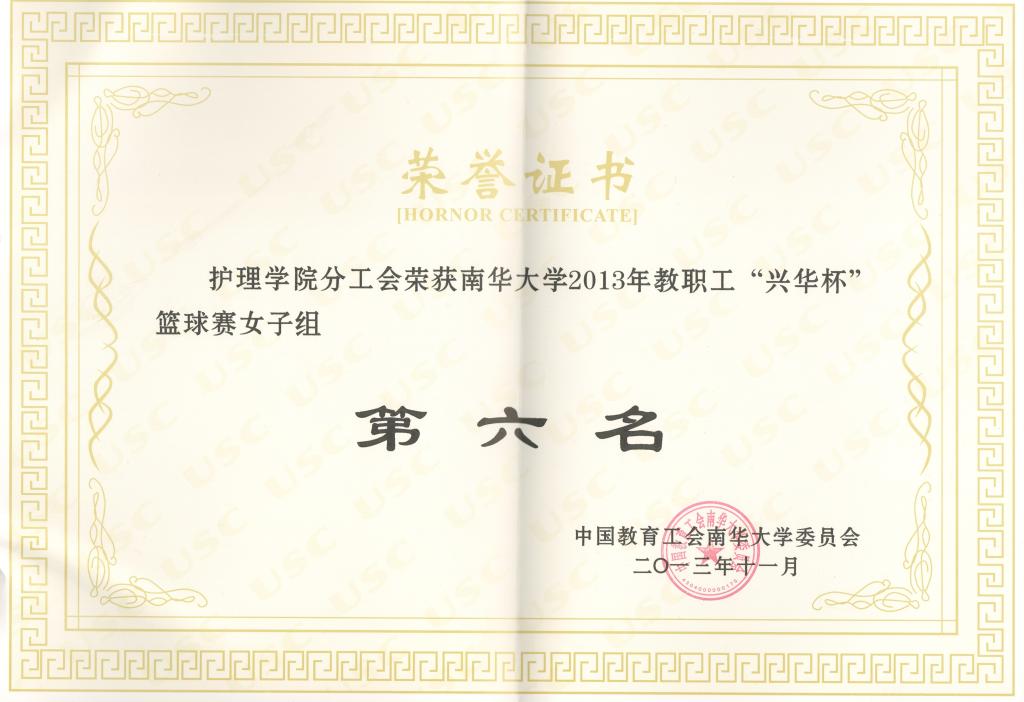 19、护理学院分工会荣获南华大学2013年教职工“兴华杯”篮球赛女子组第六名