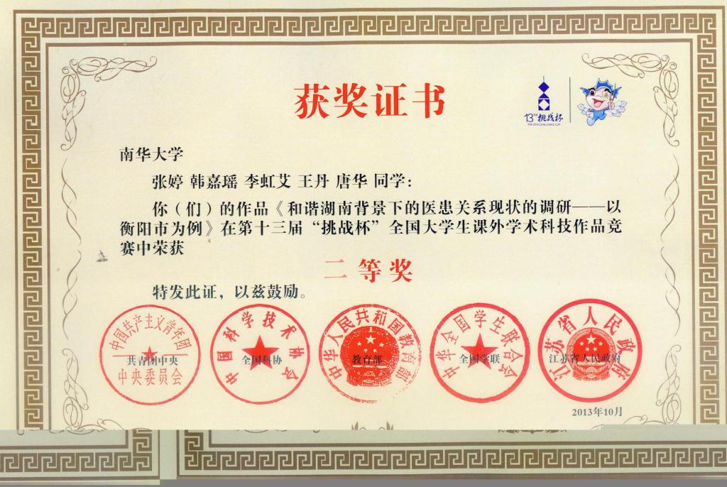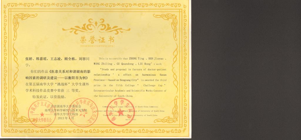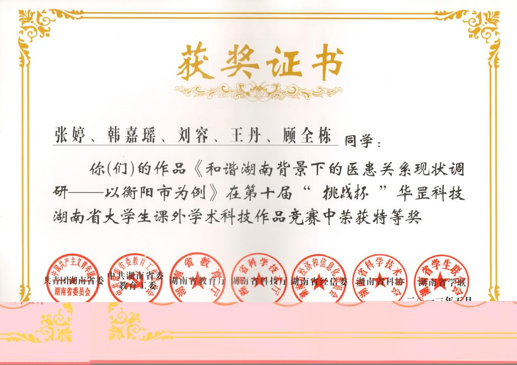 4、张婷、韩嘉瑶、刘容、王丹、顾全栋同学,你们的作品《医患关系对和谐湖南的影响因素的调研及建议——以衡阳市为例》在第十届“挑战杯”华港科技湖南省大学生课外学术科技作品竞赛中荣获特等奖。