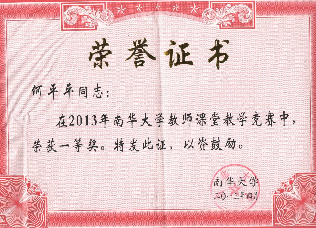 11、何平平同志在2013年南华大学教师课堂教学竞赛中,荣获一等奖。