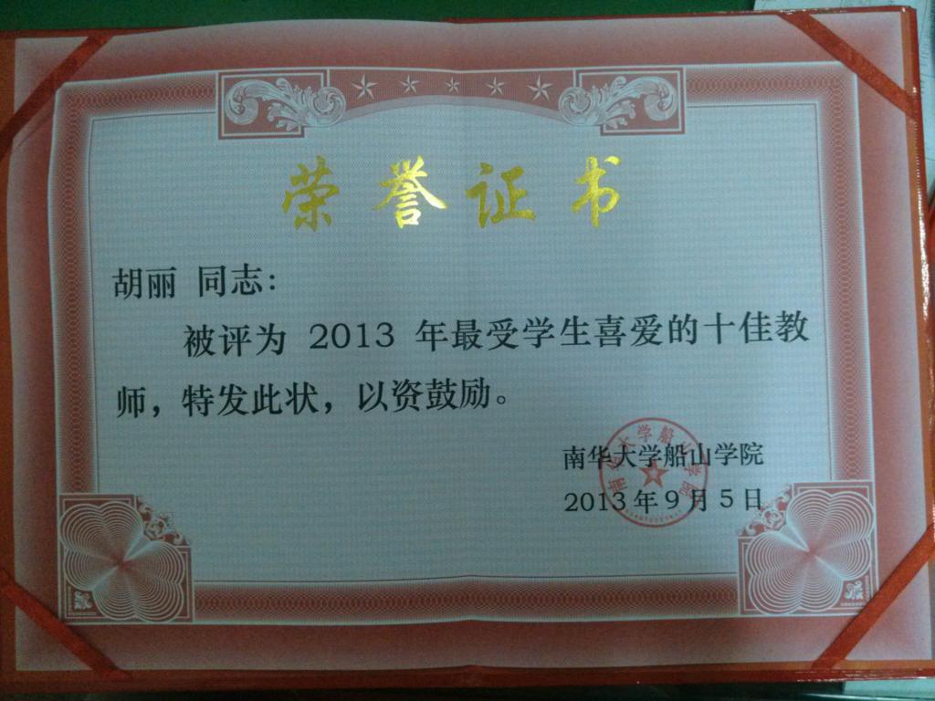 13、胡丽同志被评为2013年最受学生喜爱的十佳教师。