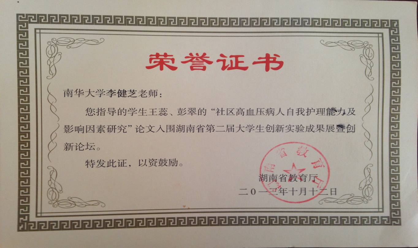 5、李健芝,您的指导学生王蕊、彭翠的“社区高血压病人自我护理能力及影响因素研究”论文入围湖南省第二届大学生创新实验成果展暨创新论坛。