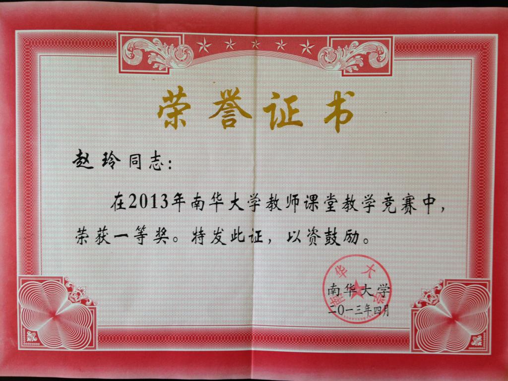 9、赵玲同志,在2013年南华大学教师课堂教学竞赛中荣获一等奖。