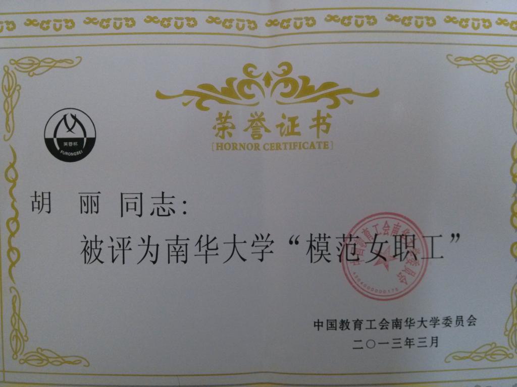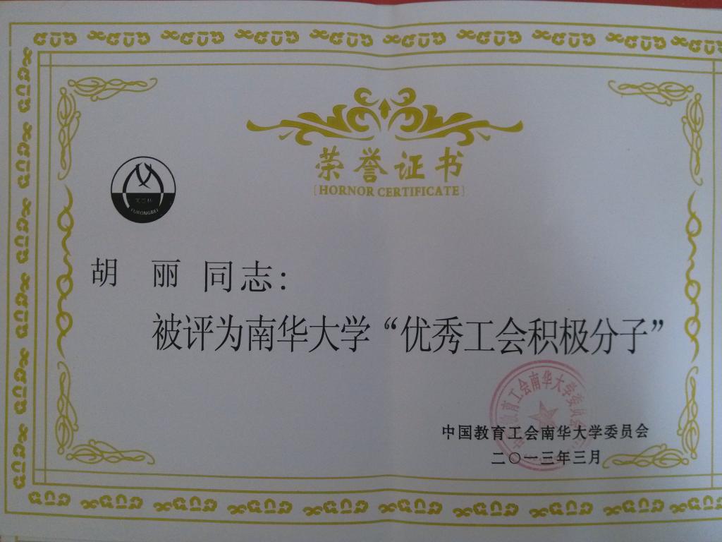 14、胡丽同志被评为南华大学“优秀工会积极分子”