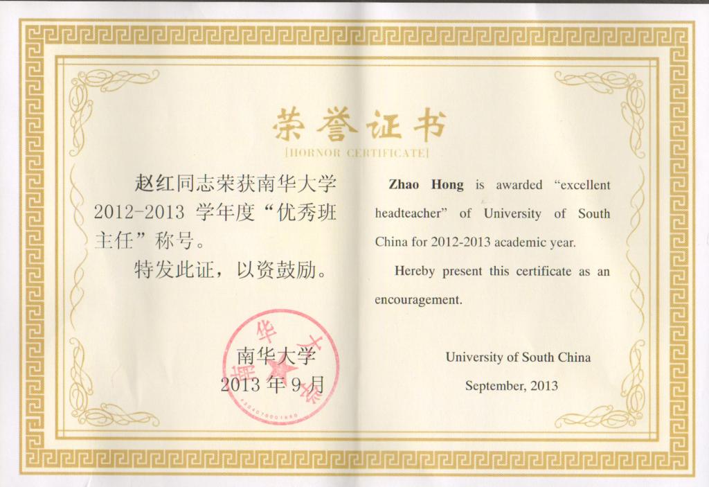 7、赵红同志荣获南华大学2012-2013年度“优秀学生班主任”称号。