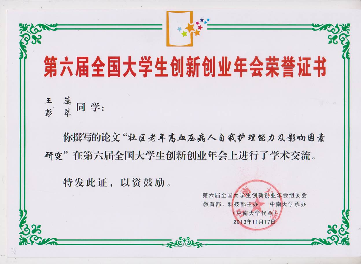 6、王蕊、彭翠同学,你们撰写的论文“社区高血压病人自我护理能力及影响因素研究”在第六届全国大学生创新创业年会上进行了学术交流。