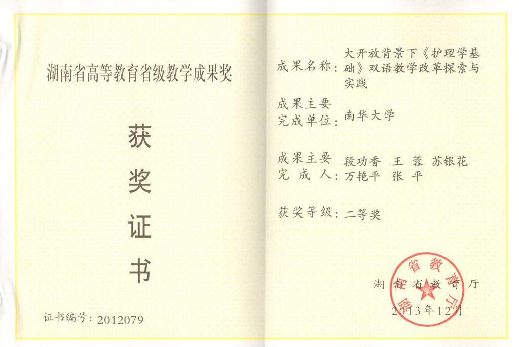 18、湖南省高等教育省级教学成果奖(证书编号:2012079),成果名称:“大开放背景下《护理学基础》双语教学改革探索与实践,”主要完成单位:南华大学。成果主要完成人:段功香,王蓉,苏银花,万艳平,张平。获奖等级:二等奖