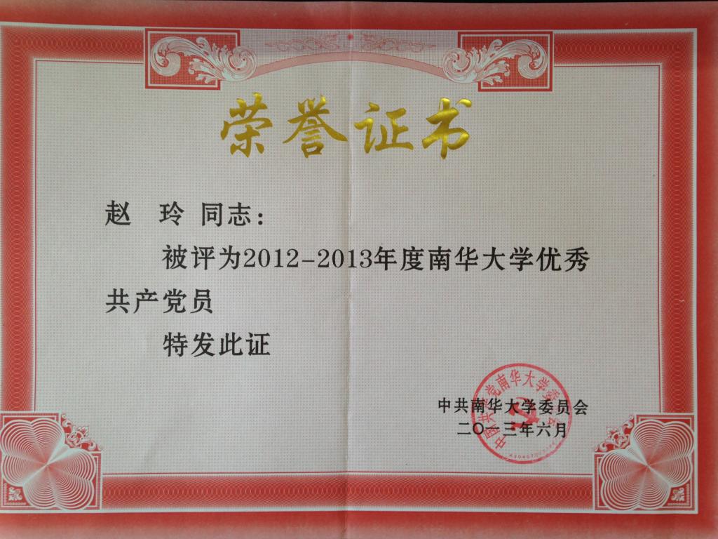 10、赵玲同志被评为2012-2013年度南华大学优秀党员。