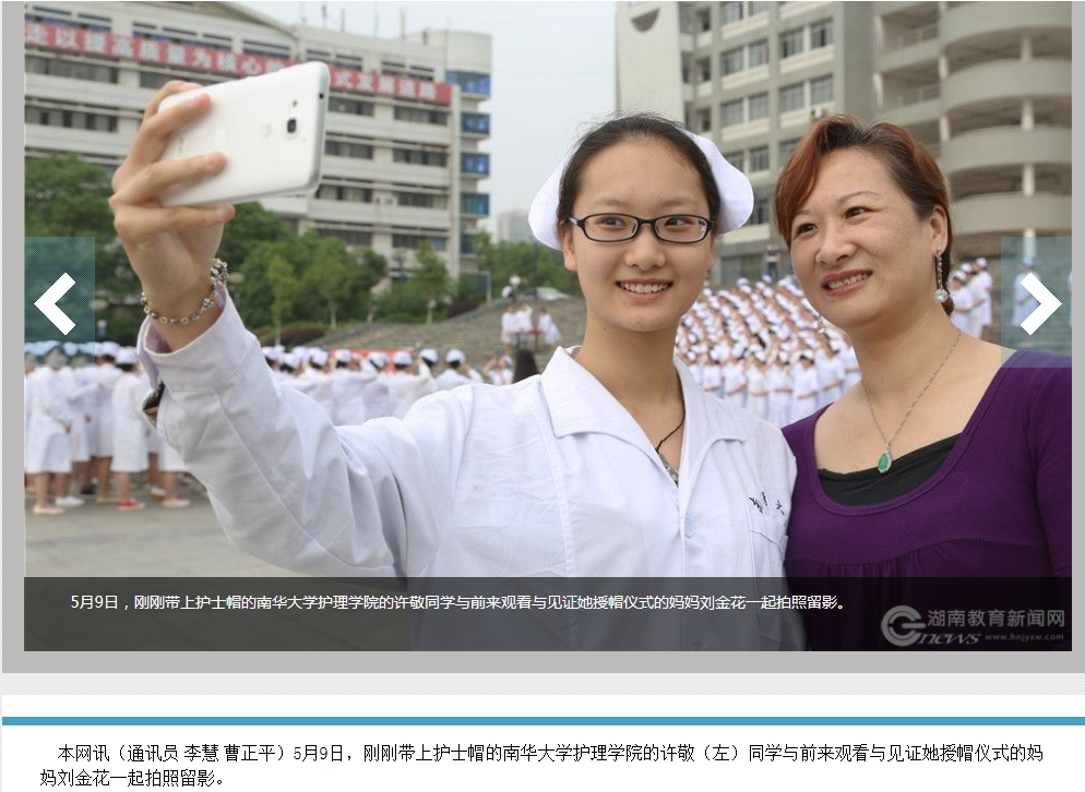 5月9日,刚刚带上护士帽的365英国上市公司的许敬(左)同学与前来观看与见证她授帽仪式的妈妈刘金花一起拍照留影。