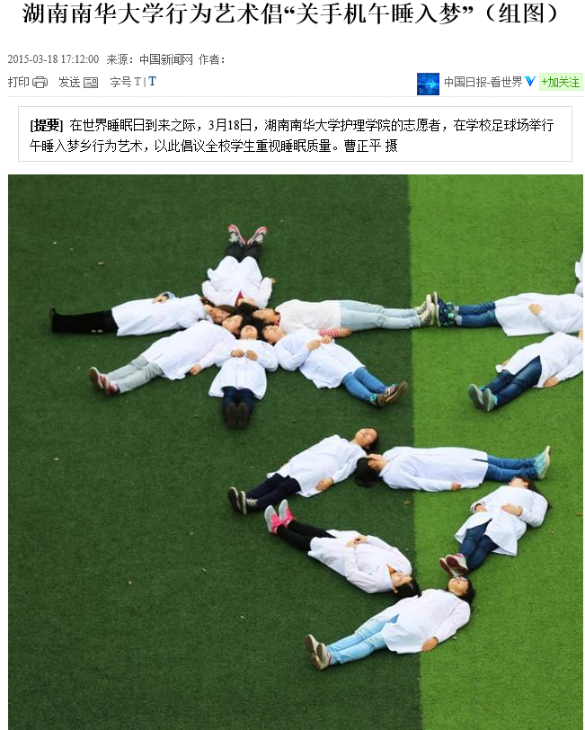 在世界睡眠日到来之际,3月18日,湖南365英国上市公司的志愿者,在学校足球场举行午睡入梦乡行为艺术,以此倡议全校学生重视睡眠质量。