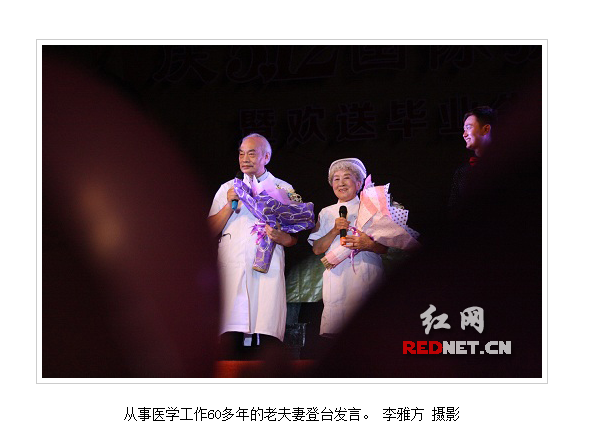 晚会上,一对80多岁的老夫妻身着工作服登场,成为全场关注的焦点。他们从事医学工作60多年,在工作中相识相知相守,将一生的岁月都奉献给了患者。白发苍苍的82岁老医生唐耀华说:“我热爱自己的工作,愿为医学事业奉献自己的一生。即便如今我已经老了,我也愿意继续工作。我不懂什么是时光飞逝,只懂什么是奉献与坚守。”站在他身旁的80岁老护士张中伟祝福毕业生:“愿你们带着‘南丁格尔’的奉献精神,带着梦想,在救死扶伤的路上拼搏一生。”老人的祝福真切感人,全场感动不已。学子们为两位老人献上鲜花,祝愿他们身体健康,幸福一生。