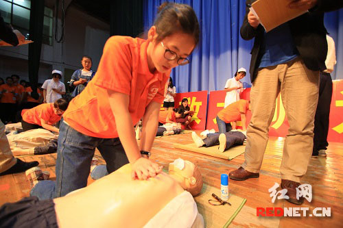 授帽仪式后,活动随即转到南校大礼堂,来自各个学院的参赛选手分为医学类和非医学类在此汇聚一堂,一决高下。现场,参赛选手对于心肺复苏展开一场技术的比拼,操作完成后回答关于紧急救援的知识。比赛最后,大赛不忘以情景再现的形式科普“海姆立克急救法”,现场教大家如何操作。