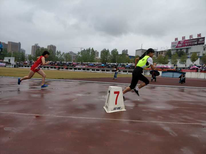 15日上午,刚刚参加完女子组200米预赛的朱婷同学在休息后跟随运动员队伍来到800米赛道前。刚下过雨,跑道湿滑,运动员们在各自的赛道上伸展身体。六号跑道上,朱婷压伸双腿韧带,小跑模拟起跑,为比赛做好准备。随着枪声令下,运动健儿们向前俯身迈开步伐,在保持体力的同时提高速度。在观众席沸腾的声浪中,八名运动员呈胶着状态进入最后一圈的赛跑。朱婷同学在临近终点时再次加速冲刺,最终获得了第六名的优秀成绩,收获了阵阵欢呼与掌声。