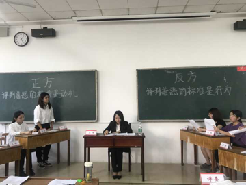 在赛事主席叶扬宣读完大赛规则之后,比赛便正式开始。赛场上双方辩手你来我往,唇枪舌战,分别围绕着自己的辩题展开了激烈的辩论。此次比赛的四个辩题分别是:安乐死应不应该合法化;艾滋病是医学问题还是社会问题;时势造英雄还是英雄造时势;评判善恶的标准是动机还是行为。