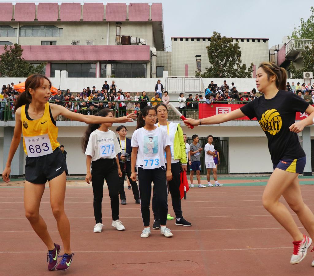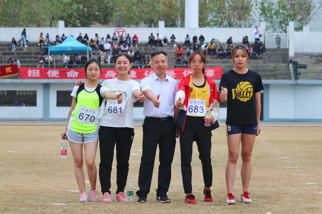 2019年10月13日下午,天色灰蒙蒙,淅淅沥沥的小雨将至,南华大学大学生运动会女子4×400接力预决赛在北校田径场内如火如荼的开展。护理学院派出了由左佳玉、李昱璇、潘彤彤、胡娟四位同学组成的队伍参赛。