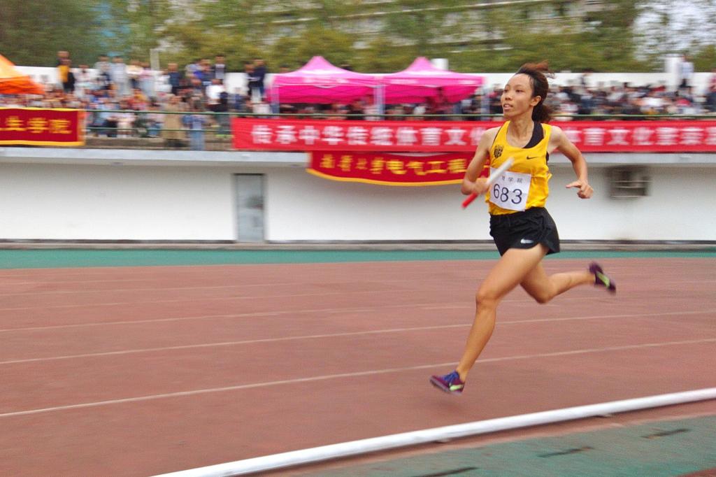 随着发令枪响,第一棒左佳玉紧握接力棒,如离弦之箭奔跑向前,迅速取得优势。紧接着,第二棒潘彤彤沉着稳健,一路奔跑,保持了相对优势。第三棒李昱璇奋起直追,在最后三十米的直道中,潘彤彤在场外为她加油鼓劲,一路陪跑,直到胜利的火炬传递到第四棒胡娟手中。胡娟健步如飞,逐日追风一般,与前一名的距离急剧缩小,看台上观众们的心被比赛紧紧牵扯住,为选手们加油欢呼喝彩的声音瞬时沸腾了起来。