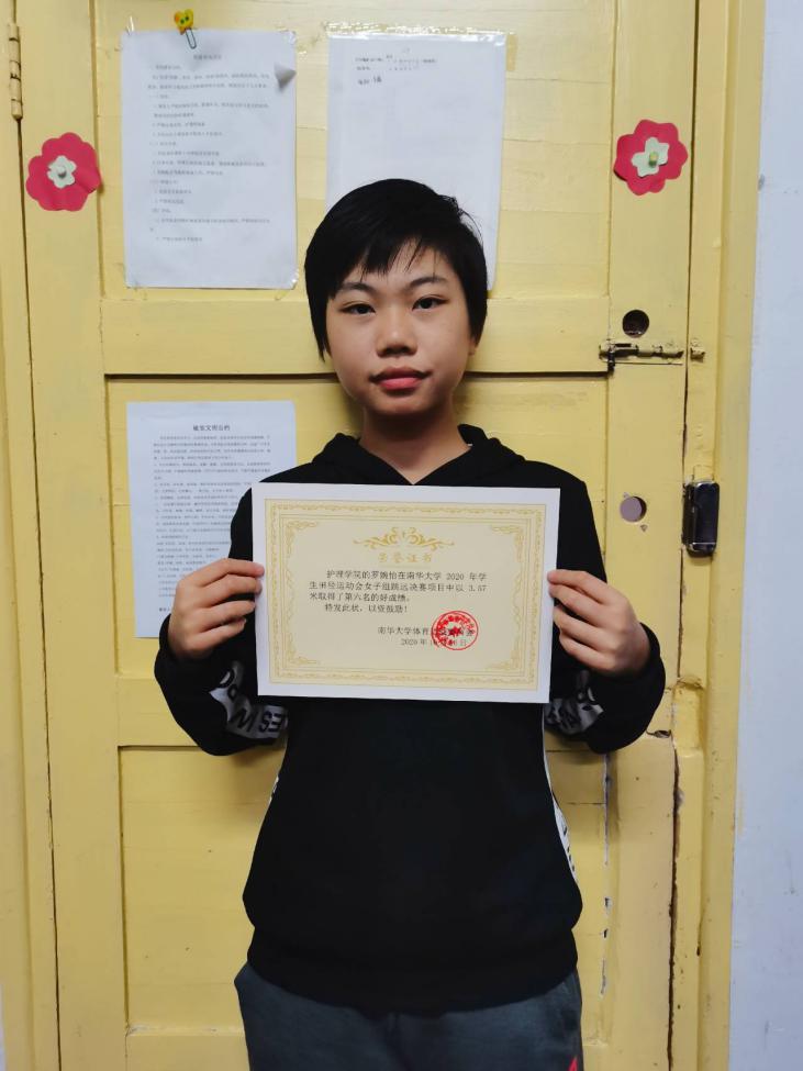 2020年10月16日下午,南华大学2020年学生田径运动会在北校田径场火热举行。护理学院运动员罗婉怡在女子跳远比赛中脱颖而出,以3.57米的优异成绩取得了比赛的第六名。