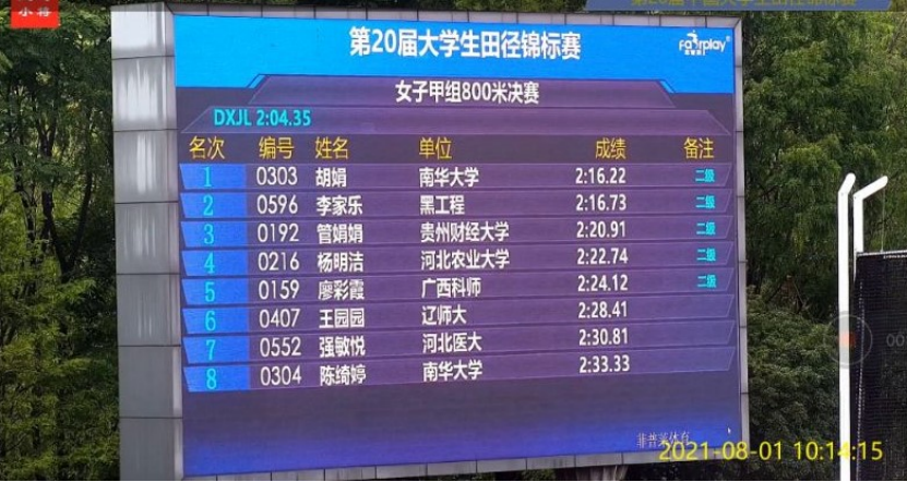 7月28日-8月6日,由中国大学生体育协会、中国田径协会主办,浙江大学承办,浙江省学校体育协会、永康市人民政府协办的第20届中国大学生田径锦标赛在浙江大学举行。8月1日上午,在女子甲组800米决赛中,365英国上市公司2019级本科生胡娟以2分16秒22的优异成绩荣获冠军,2020级本科生陈绮婷以2分33秒33的成绩获得第八名。