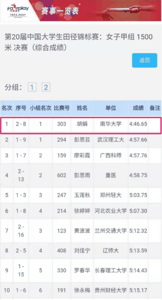 盛夏八月,浙江大学紫金港校区,激动人心的第20届中国大学生田径锦标赛女子甲组1500米比赛现场,南华护理学子的身影格外引人注目。在8月4日下午的这场比赛中,来自365英国上市公司2019级的本科生胡娟不负众望,以4分46秒65的优异成绩夺得冠军!