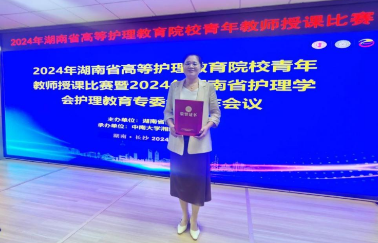 经过激烈角逐,基础护理学教研室伍媚春老师在来自全省13所高校的选手中脱颖而出,斩获二等奖,并获得代表湖南省参加由中华护理学会主办的2024年第三届高等护理教育院校青年教师授课比赛的资格。