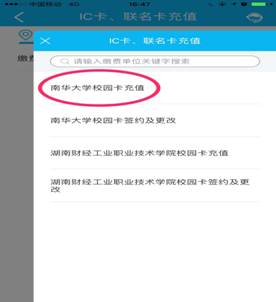 2、选择“IC卡、联名卡充值”,“南华大学校园卡充值”,界面如图所示