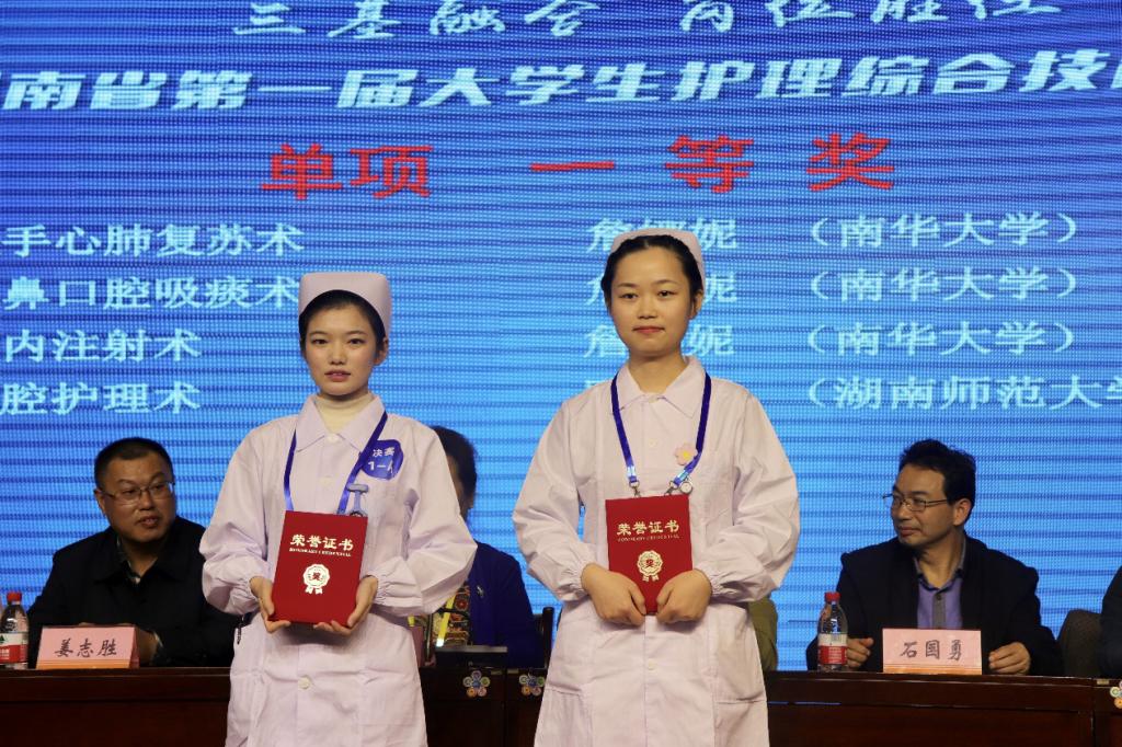 经过一天激烈地角逐,最终南华大学以团体总分第一名荣获本次比赛团体一等奖,中南大学和湘南学院获得团体二等奖,湖南师范大学医学院、吉首大学和湖南师范大学树达学院获得团体三等奖。南华大学詹娜妮、获得徒手心肺复苏术、经鼻口腔吸痰、皮内注射术三个单项一等奖,湖南师范大学欧江燕获得口腔护理术单项一等奖。中南大学谢俊菊等9名选手分别获得四项单项二等奖,湖南师范大学医学院朱清香等6名选手分别获得四项单项三等奖。中南大学、南华大学、湖南师范大学医学院获得优秀组织奖。