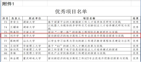 近日,教育部办公厅印发《关于公布首批新工科研究与实践项目结题验收结果的通知》(教高厅函〔2020〕12号),南华大学副校长刘升学主持的项目《面向新经济的地方高校工科专业改造升级路径探索与实践》结题验收评价为"优秀",是湖南省属高校唯一评价为优秀的项目。
