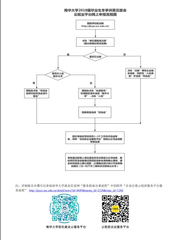 1.会议报名方式:请与会单位在 2017 年 11 月 20 日前登录南华大学就业信息网,按照背面附件步骤要求在南华大学就业信息网进行注册、报名、确认参会意向。同时将招聘信息、参会人员和营业执照复印件等信息按要求上传,以便我校审核、安排、布置双选会会场的展位。申请通过后并关注微信公众号“云校招企业服务平台”实时接收会议各项安排信息。同时谢绝房产中介、电话销售的企业参加;谢绝带有“培训+推荐工作”等收费项目参加。