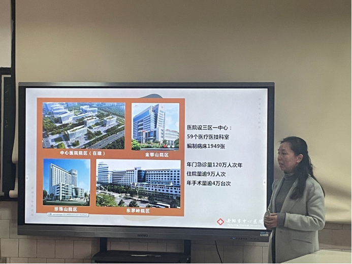 紧接着,岳阳市中心医院领导和来宾与参会学生进行交流。甘星亮主任从岳阳市中心医院情况简介、护理部工作详情等方面展开介绍,并用视频生动展示了医院的具体情况。其中,她从工作待遇、工作保障、队伍建设、科学护理管理、拓展服务内涵及范围等多方面着重介绍了医院护理部的工作详情。