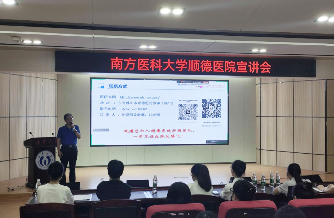 南方医科大学顺德医院由院护理部主任吕春梅带队,一行4人来校,主要围绕护士招聘、硕士研究生导师、实习生临床实践等内容进行交流讨论。吕春梅就医院地理位置、生活宜居程度、薪资待遇以及医院的综合实力等方面进行了详细的讲述,特别强调了医院重视岗前培训、鼓励学历提升等人才引培战略。顺德医院烧伤科护士长、南华大学优秀校友肖志平向同学们介绍了顺德这座城市,并分享了顺德医院的福利待遇、城市房价、发展平台、科研经费等支持措施,希望更多学弟学妹能够加入顺德医护大家庭。