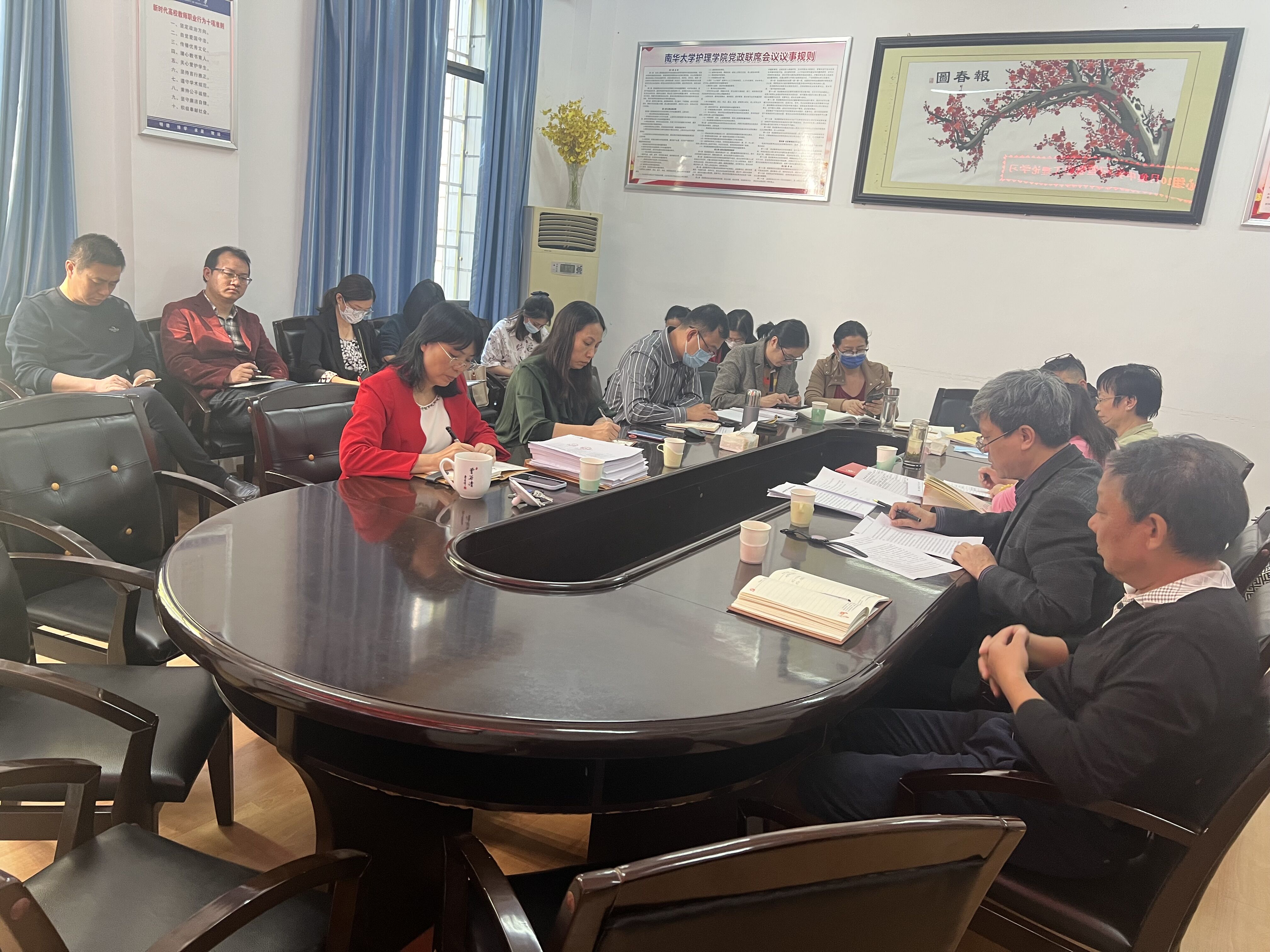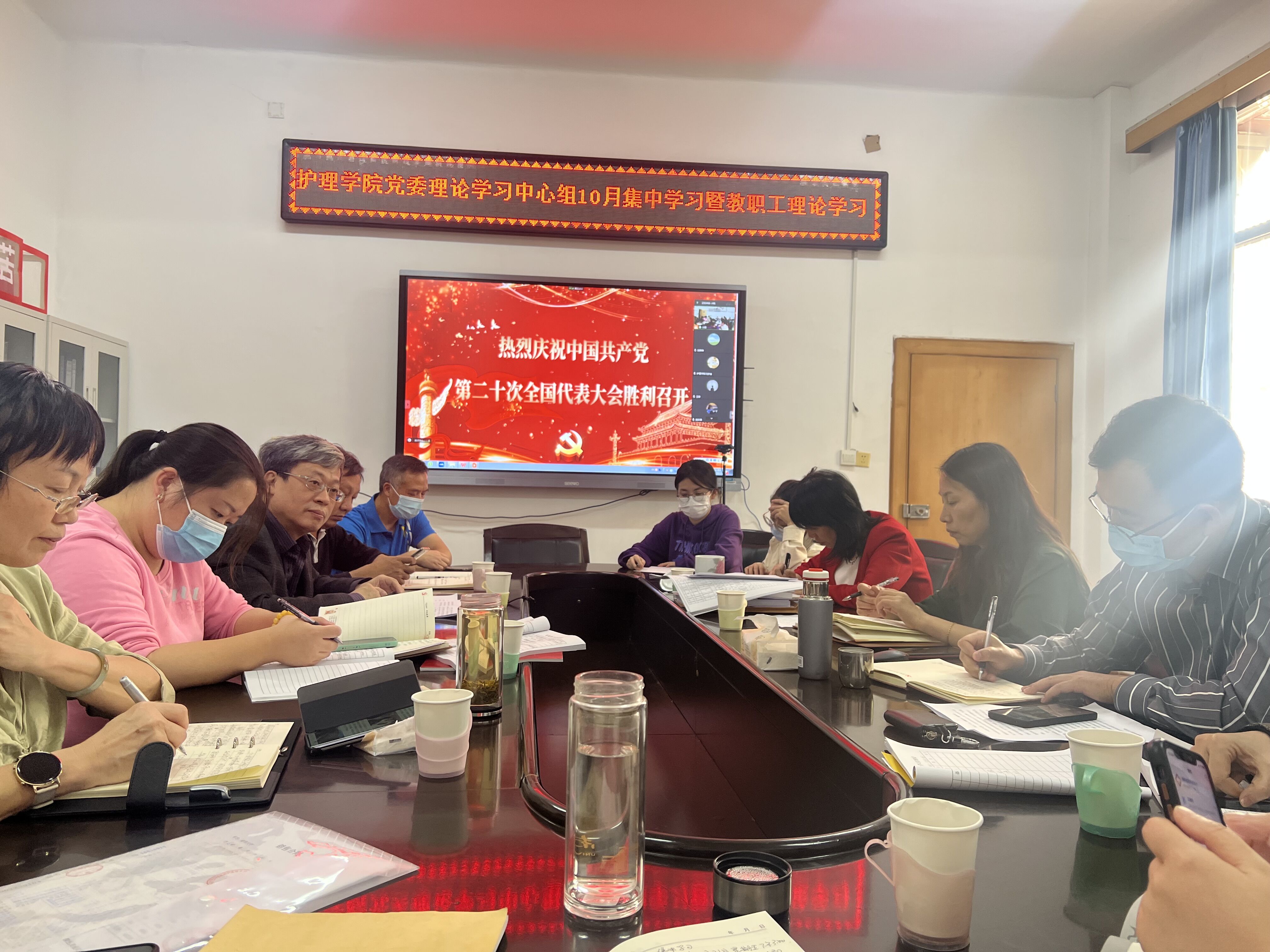 2022年10月21日下午,护理学院党委理论学习中心组10月集中学习暨教职工理论学习在学院会议室举行。学习主题是“深入学习领会党的二十大报告精神,全面贯彻党的教育方针,落实立德树人根本任务,汲取护理专业开办37年和学校成立64年以来的宝贵经验和精神财富,奋力推进学院一流建设,奋力推进新时代高水平大学建设。”集中学习在线上线下同时进行。全体院领导、党委委员、支部书记、科室负责人、院团委书记、学术委员会成员代表、教师党员代表、学生党员代表和团学干部代表参加线下学习。其他教职工和学生党员参加线上学习。党委书记袁春阳主持学习。