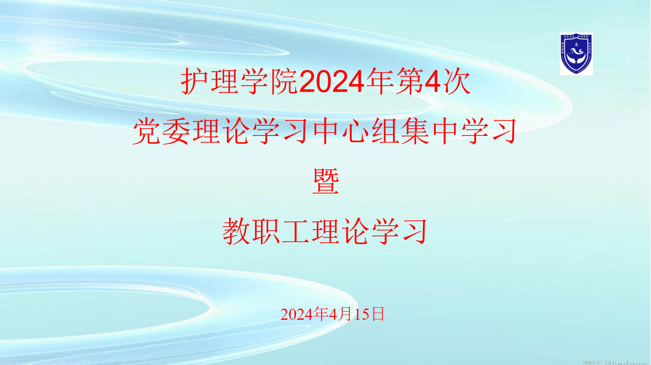 4月15日(星期一)上午9:00, 护理学院党委在学院会议室开展2024年4月理论学习中心组集中学习暨教职工理论学习。学习活动由学院党委书记袁春阳主持。在校的学院中心组成员参加线下学习,其他教职员工通过线上参加学习。