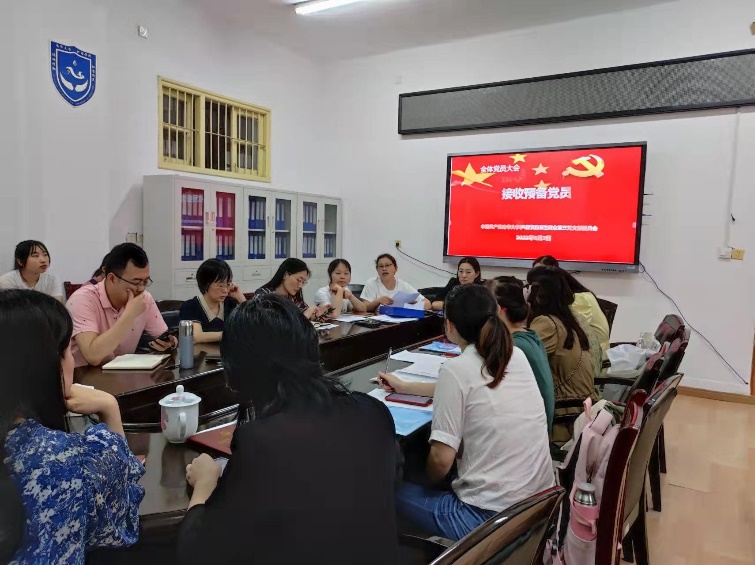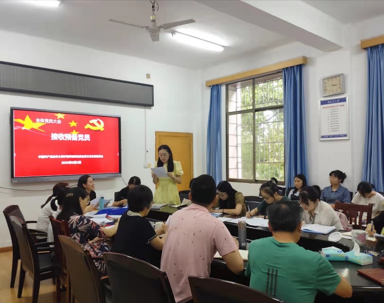 会议主要讨论关于肖露微、冷娟娟、王傲一、姚可茹、年芳、唐鑫、龙华7位发展对象接收为预备党员的问题。首先是发展对象汇报考察一年期间的表现情况,入党介绍人介绍发展对象的主要情况、并对其能否入党表明意见,接着支委会向支部大会报告对发展对象审查的情况及征求党内外群众意见情况,与会党员发表意见,对发展对象能否入党进行讨论,发展对象表态,最后与会党员进行无记名投票表决。肖露微、冷娟娟、王傲一、姚可茹、年芳、唐鑫、龙华7位同志均全票通过,顺利接收为预备党员。