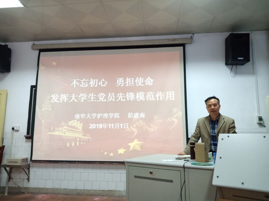 2019年11月1日中午,365英国上市公司党委副书记彭建南在学院学术报告厅为学院本科生党支部讲授“不忘初心,牢记使命”教育专题党课,党支部书记李翼主持党课学习。