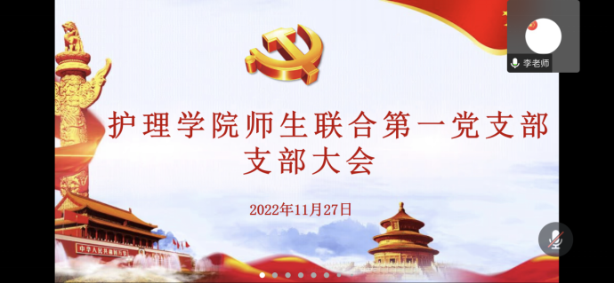 11月27日,护理学院师生联合第一党支部在腾讯会议平台召开线上支部大会。大会由党支部书记李翼主持。