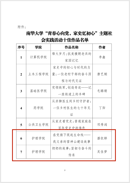 3月10日,2025年南华大学“青春心向党,家史忆初心”研究生寒假社会实践活动十佳作品名单揭晓。护理学院师生联合第四党支部潘依婷和吴佳梦两位同学凭借出色的作品脱颖而出,成功入选。