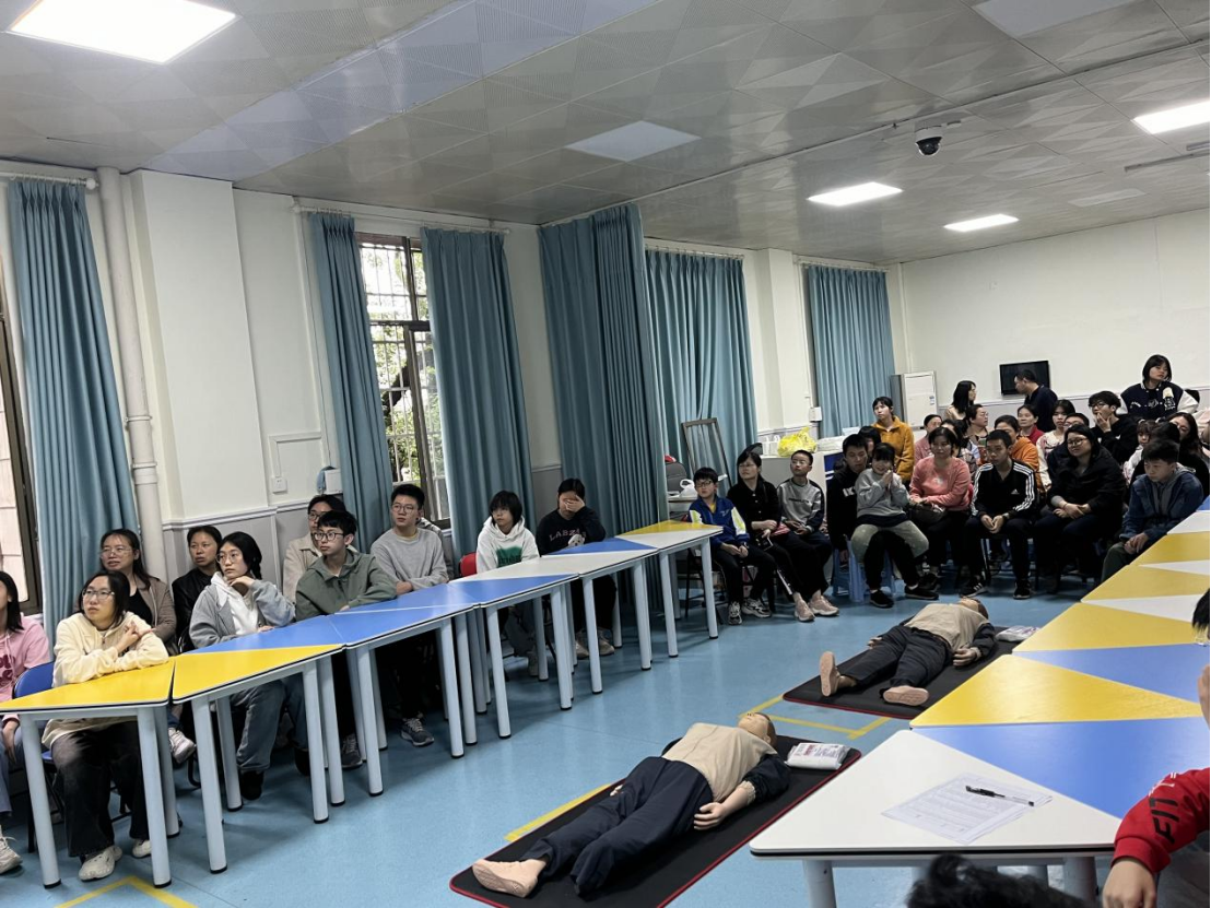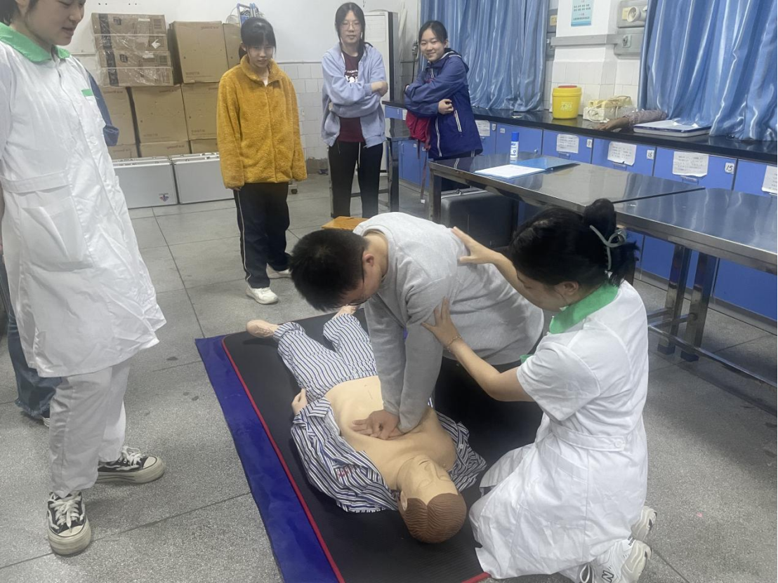 在实操环节,参与学生分为四组,在护理学院216和217实验室进行实操训练,每组配备两名指导老师。同学们积极参与,对心肺复苏进行上手操作训练,指导老师在一旁耐心指导,细致入微地讲解操作流程、纠正错误动作。通过实操训练,同学们都能够熟练地完成心肺复苏急救操作。