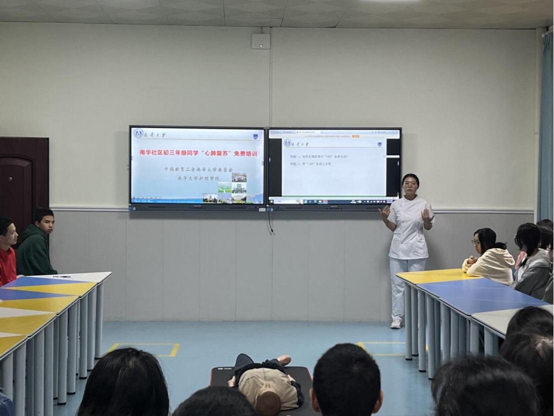 衡阳市于2023年在湖南首个发起体育中考改革,将急救术(心肺复苏术)列为中考体育加分项目。为积极响应政策改革号召,让学生掌握常用的急救知识和技能,提升学生互救自救的能力,中国教育工会南华大学委员会联合护理学院为南华社区初三在读学生开展“急救术(心肺复苏)”免费培训活动。