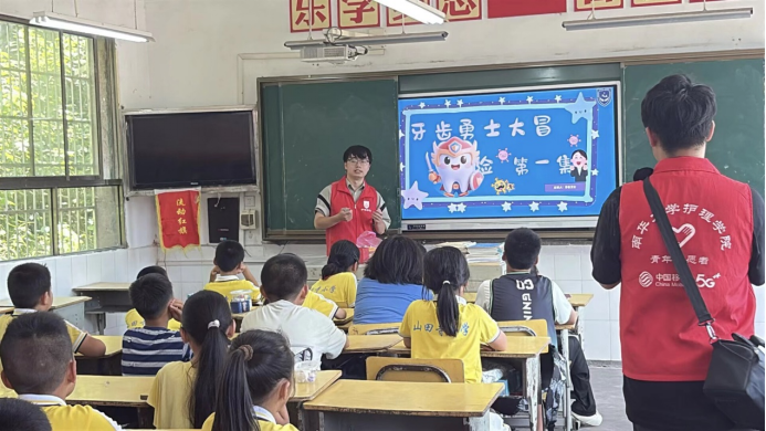 在特色健康课堂环节,团队精心设计“护牙小卫士”互动课程。通过牙齿模型演示、趣味动画等形式,生动讲解口腔保健知识。志愿者们还特别关注留守儿童心理健康,通过绘画、游戏等艺术疗愈方式,帮助孩子们表达情感,建立自信。