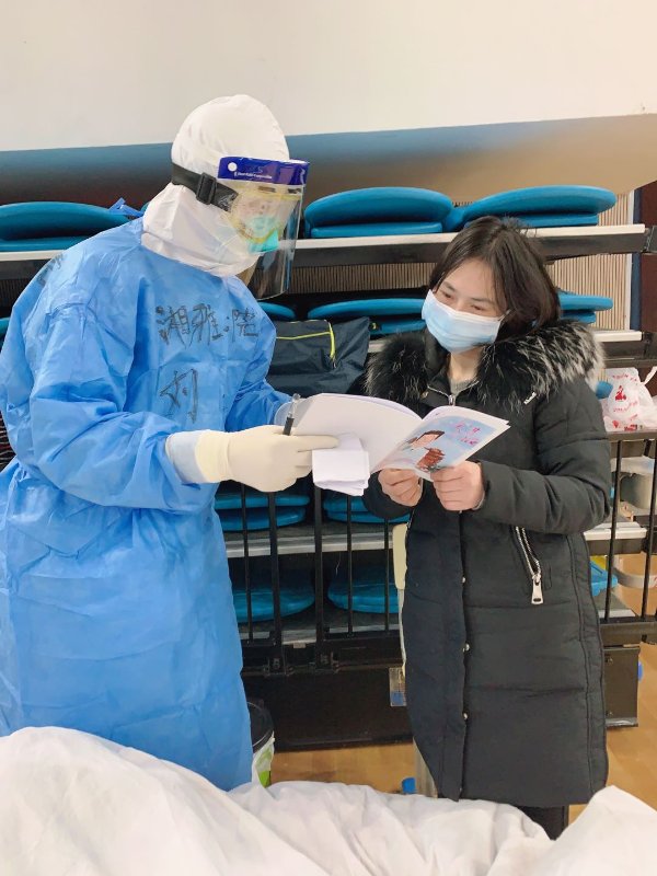 在记录方舱医院生活的视频中,我们看到穿着厚重隔离服的刘进在治疗护理之余,会走进每一个患者的身边用心地与之交谈,观察患者情绪变化,耐心记录着患者的点点滴滴。在方舱医院的时间总是很漫长,这时刘进会带来几本关于心理方面的书给患者阅读,打发这闲暇无聊的时光。其中《走进方舱》和《走出方舱》这两本书是刘进所在科室特意为此次疫情所撰写的,他们希望能够给予患者更多抗击疫情的勇气信心与毅力。