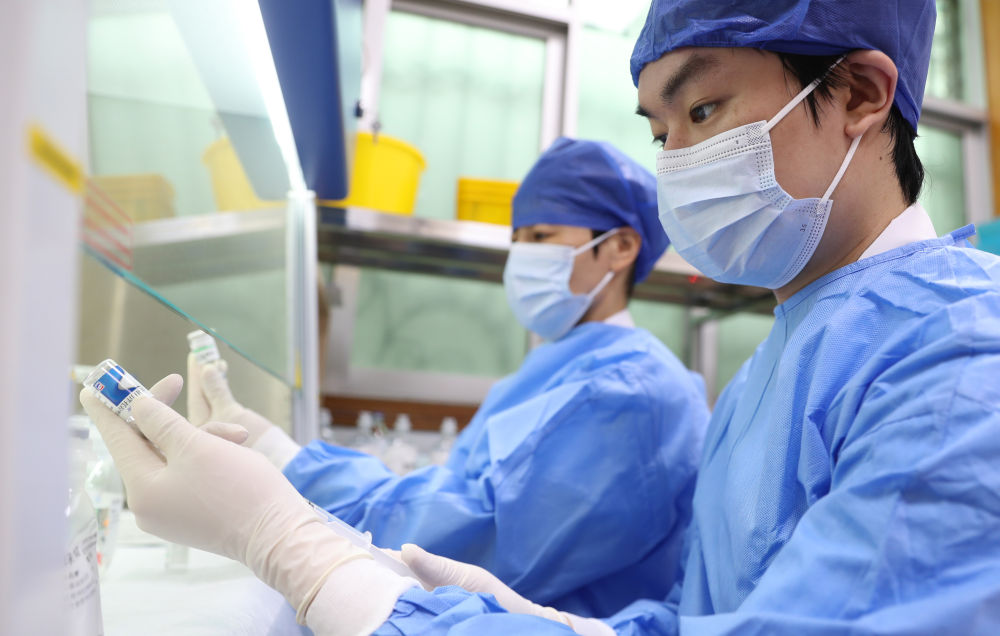 2024年5月9日,南华大学附属第一医院乳腺淋巴瘤病区,周遥和妈妈一起配制药品。