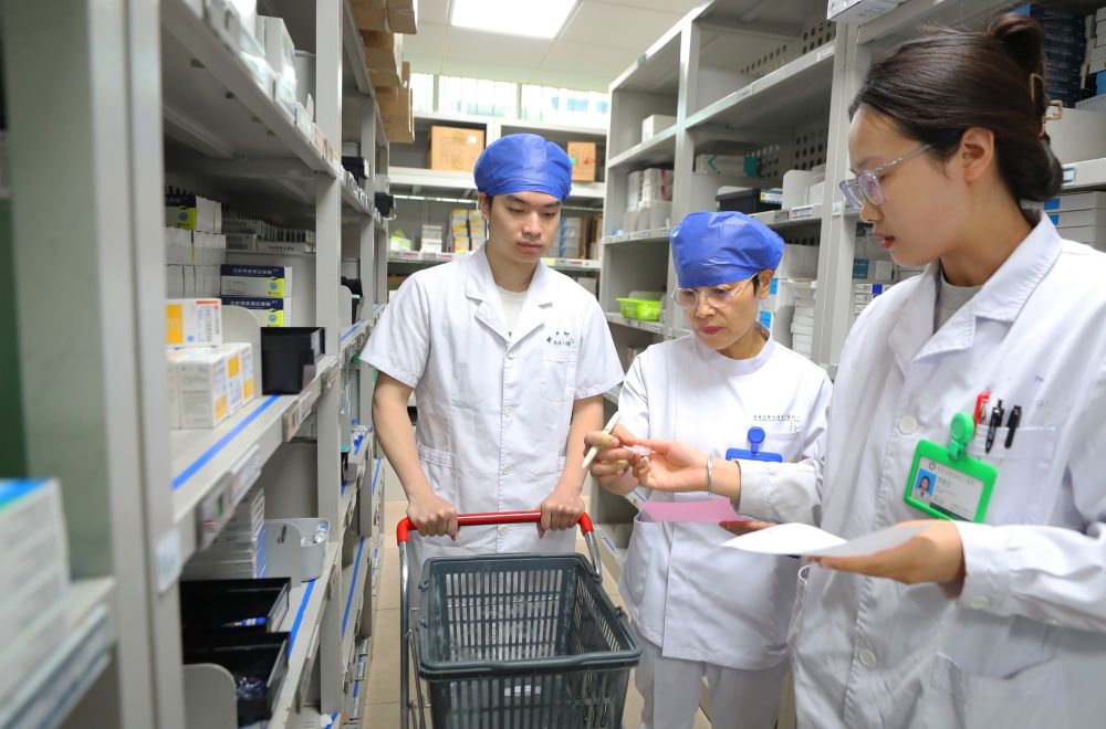 ↑2024年5月9日,南华大学附属第一医院药房,周遥(左)和妈妈于凤华(中)在领取药品。