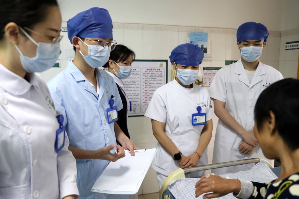 2024年5月9日,南华大学附属第一医院乳腺淋巴瘤病区,周遥(左五)和妈妈(左四)在参加护理查房。