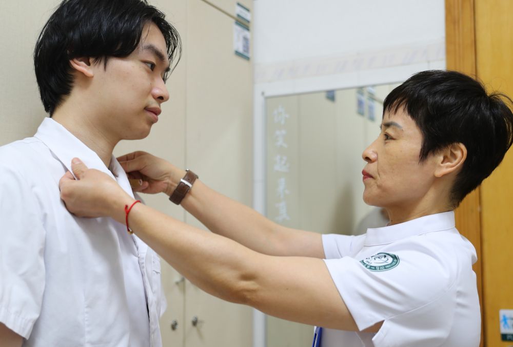 2024年5月9日,南华大学附属第一医院乳腺淋巴瘤病区,妈妈帮周遥整理护士服。