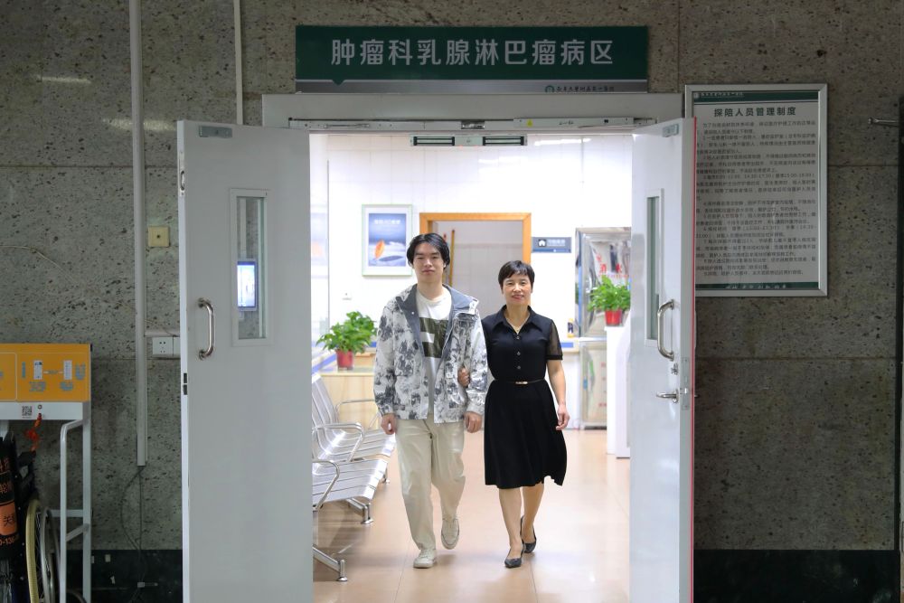 2024年5月9日,南华大学附属第一医院乳腺淋巴瘤病区,周遥和妈妈完成当日工作后一起下班走出病区。