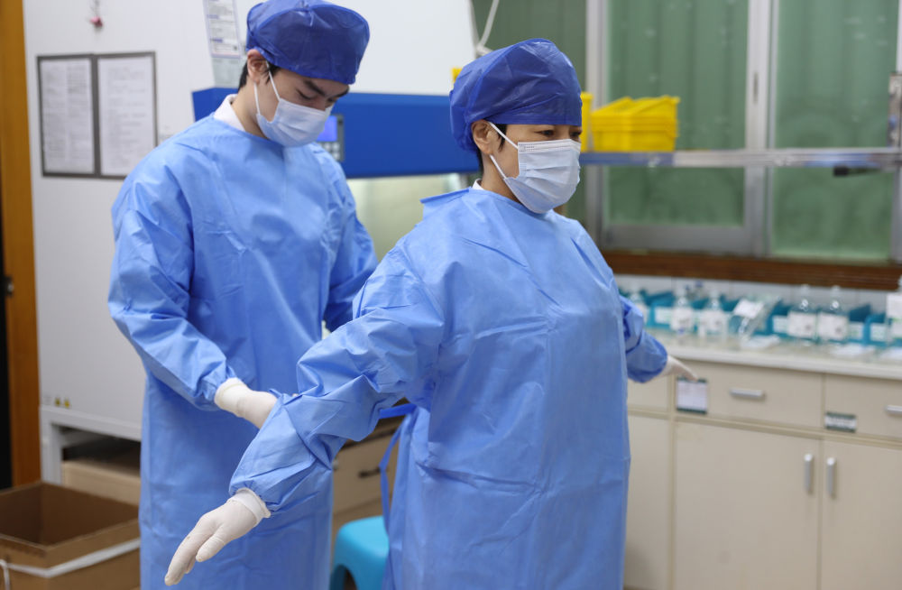 2024年5月9日,南华大学附属第一医院乳腺淋巴瘤病区,周遥(左)帮妈妈穿隔离服。