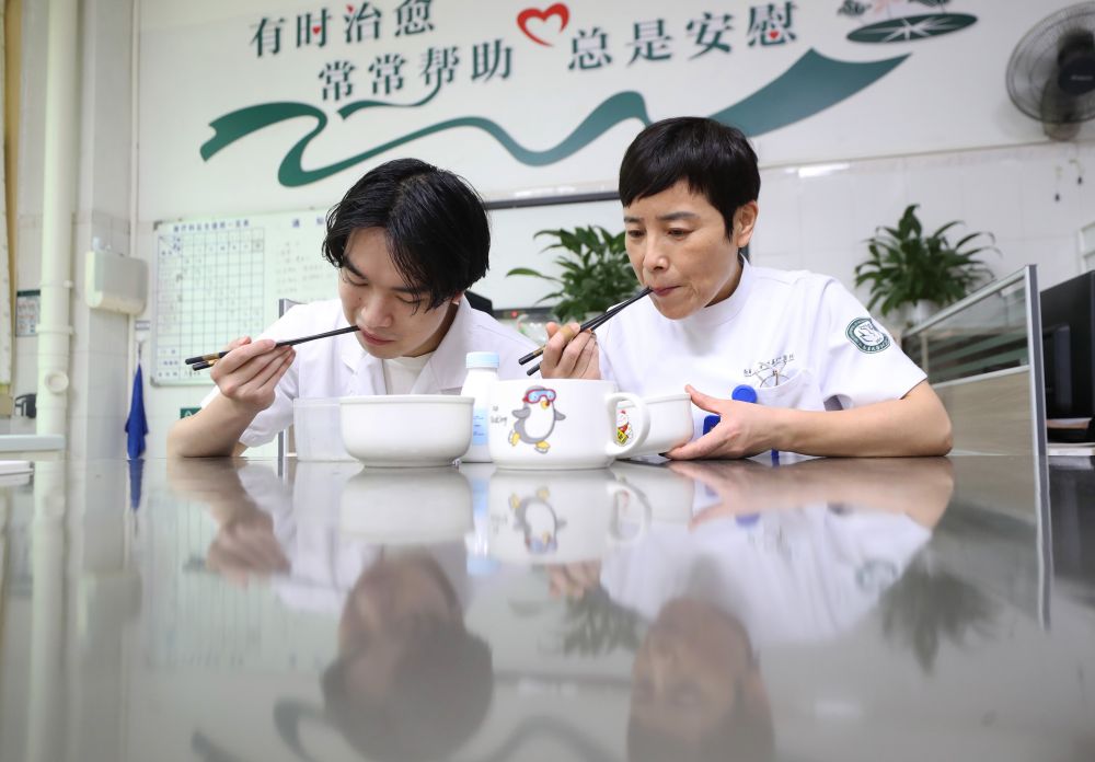 2024年5月9日,南华大学附属第一医院乳腺淋巴瘤病区,周遥和妈妈在吃午饭。