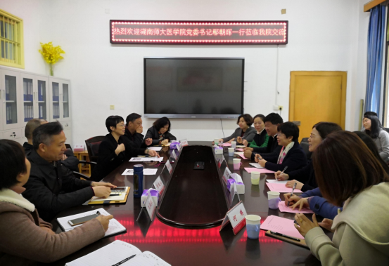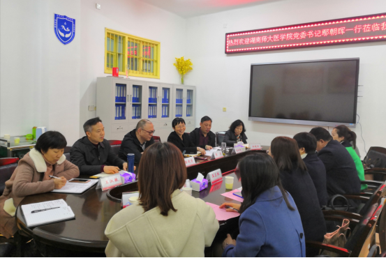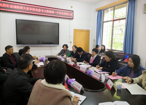 2021年4月6日上午,湖南师范大学医学院党委书记鄢朝晖、党委副书记陈松带领党委办、学工办、团委一行9人到我院考察调研。护理学院党委书记陈晓坚,院长廖力,党委副书记彭建南,组织员刘和福,院办主任王晓兰,教务办主任王淑敏出席座谈交流会。此次交流会在护理学院二楼会议室举行。