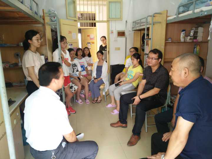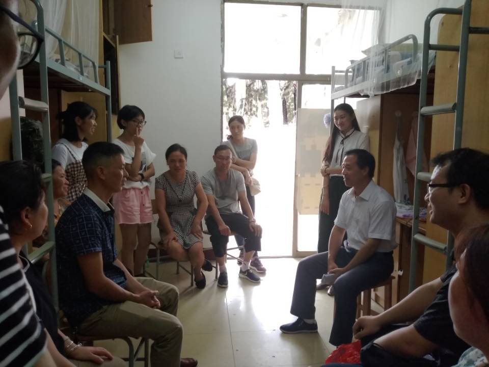 随后,两位老师又来到致远园女生寝室。师生、家长齐聚一处,亲切交谈,笑语满屋。老师们询问了同学们的家庭情况及入校感受,嘱咐了大家初来要注意财产安全和用电安全。在校的新生家长们热情的加入话题,主动与老师进行亲切交谈,询问教学及生活上的问题。老师们逐一进行了解答。